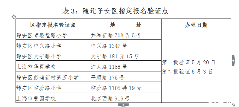 2018年5月20日,来沪人员随迁子女家长须带领适龄儿童,到就近的区指定报名验证点(见表3)报名验证,区教育局对已完成入学信息登记的适龄儿童以及家长的证件进行现场核对,符合入学条件的来沪人员随迁子女,由区教育局统筹安排入学。携带材料如下: