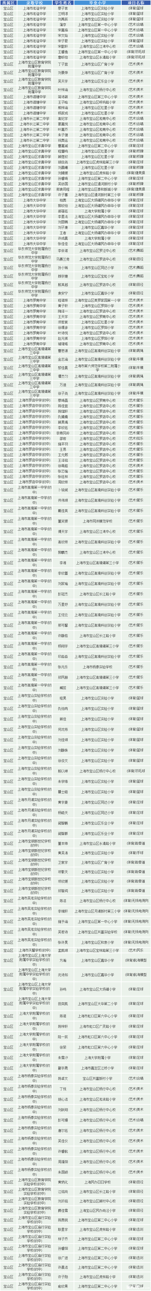 2019上海宝山区艺体特长生预录取名单
