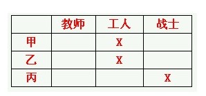 2.在甲、乙、丙三人中,有一位教师、一位工人、一位战士。已知丙比战士年龄大,甲和工人不同步,工人比乙年龄小。请你判断他们三人的职业。