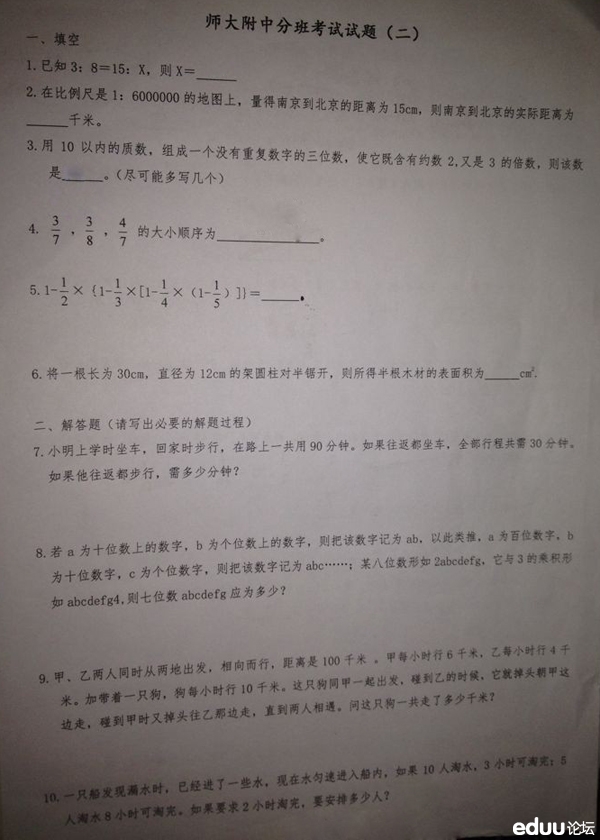 昨天晚上热心家长找到小编,提供了2013年师大附中小升初分班考试数学卷子,在这里小编代表小升初的家长们谢谢这位朋友,试题处理好已经传给桑老师了,相信很快就能让大家看到解析,请大家关注【桑其鹏老师】往年小升初真题解析(3月5号更新)
