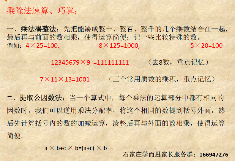 2014石家庄小升初分班考之计算、杂题篇:乘除法速算