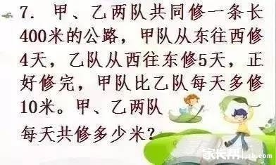 解题思路:根据甲队每天比乙队多修10米,可以这样考虑:如果把甲队修的4天看作和乙队4天修的同样多,那么总长度就减少4个10米,这时的长度相当于乙(4+5)天修的。由此可求出乙队每天修的米数,进而再求两队每天共修的米数。