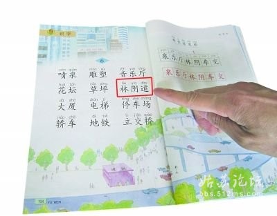 带着网友的质疑,记者来到苏州新区狮山实验小学。在校方提供的江苏教育出版社出版的小学一年级上学期教科书第104页上,记者果然看到了“林阴道”一词。该小学一年级语文教师陆菊敏告诉记者,他从事小学语文教育已经有17年了,自从语文书从人教版换成苏教版后,这15年里一直都是“林阴道”,他们也是一直这样教的。