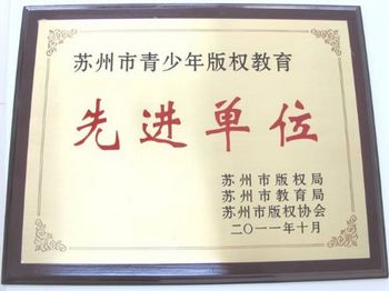 2011年10月我校喜获苏州市版权局、苏州教育局、苏州市颁发的“苏州市青少年版权教育先进单位”荣誉称号。今年获此殊荣的全大市仅三所学校(含大专院校)。