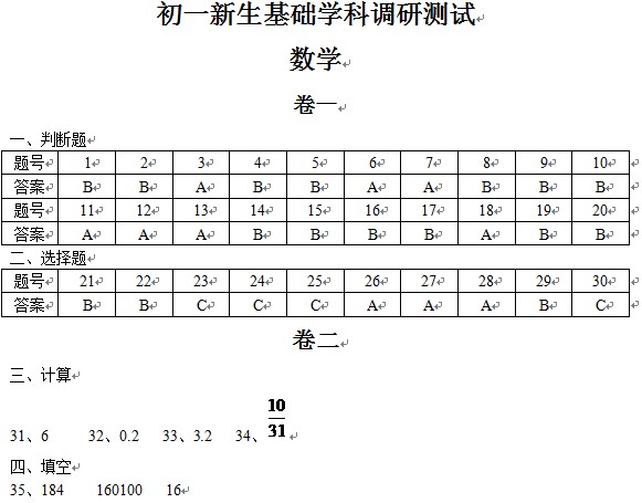 苏州初一新生基础学科调研测试数学答案