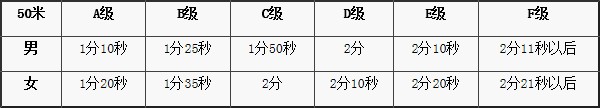 5.考试每人游一次,当受测者到达终点用手触壁时停表,使用电子秒表,登记成绩以秒为单位(小数点后不计)。