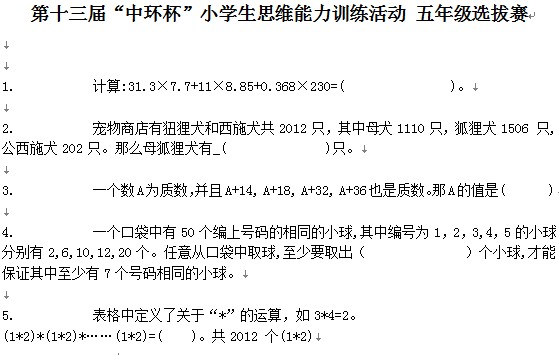 摘要:2012年上海第十三届中环杯数学竞赛在上周六顺利进行,苏州部分中小学生也前往上海参赛,苏州奥数网整理第十三届中环杯试题及答案,四年级、五年级、六年级及初一试题及答案,供学生和家长们参考。(点击查看四——初一年级试题汇总)