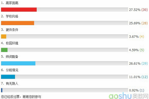 上图是我投完票之后显示出来的各位家长的意见分布图,可以看出,家长最关心的分别是“离家距离”“学校风格”“师资配置”这三点。我无法理解,我先说说我投的三票,分别是“离家距离”“分班情况”“有无熟人”。