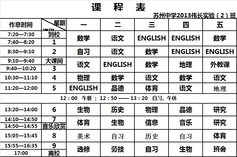 苏州奥数网讯:苏州中学伟长班是苏高中的创新实验班级,伟长班的课程与其他一般初中有什么区别呢?以下是e度网友分享的伟长班课程表,供家长们参考。