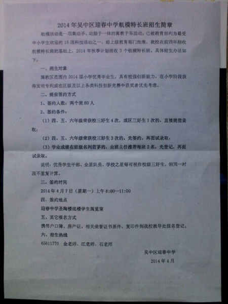 苏州奥数网讯:吴中区迎春中学近日发布了航模班的招生信息,吴中区小学的家长收到了迎春航模班招生简章,航模班招生提前签约开始了。以下是迎春中学航模班招生简章,供家长们参考。