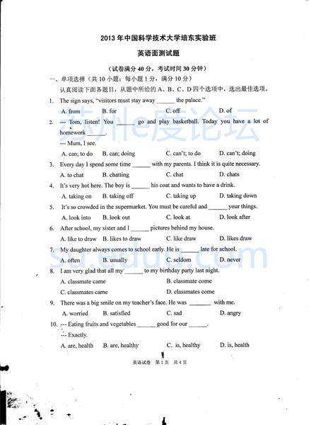 2013年中科大培东实验班英语试题及答案