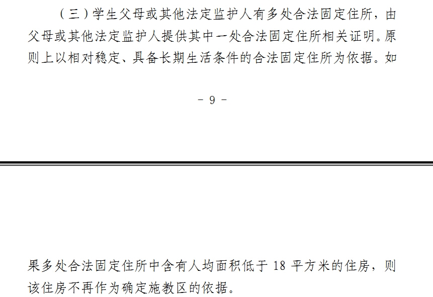 (三)学生父母或其他法定监护人有多处合法固定住所,由父母或其他法定监护人提供其中一处合法固定住所相关证明。原则上以相对稳定、具备长期生活条件的合法固定住所为依据。如果多处合法固定住所中含有人均面积低于 18 平方米的住房,则该住房不再作为确定施教区的依据。