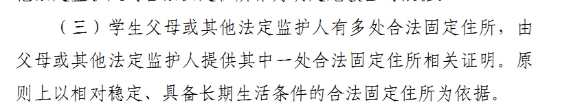 (三)学生父母或其他法定监护人有多处合法固定住所,由父母或其他法定监护人提供其中一处合法固定住所相关证明。原则上以相对稳定、具备长期生活条件的合法固定住所为依据。