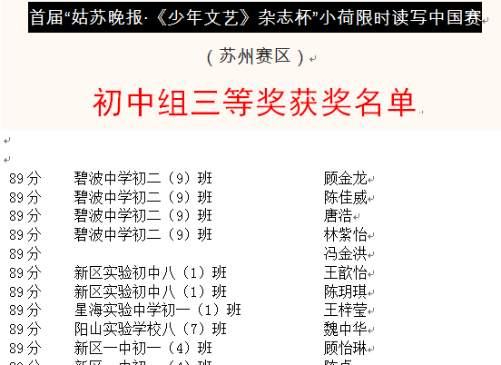 2014年小荷限时读写(苏州赛区)初中组三等奖获奖名单 本站原创 2014-06-03 15:13:43 苏州奥数网讯:首届小荷限时读写(苏州赛区)获奖名单公布,以下为word版,方便大家查找。[查看原帖参与讨论] 点击下载word版本>>>初中组三等奖获奖名单