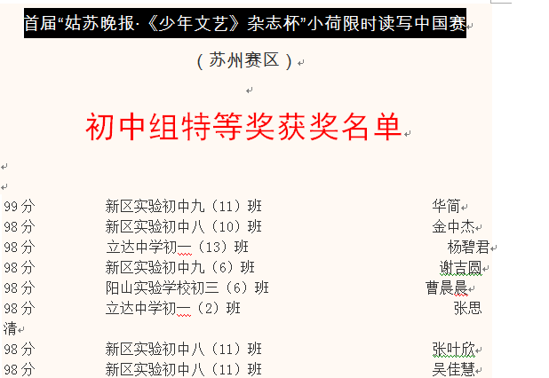 2014年小荷限时读写(苏州赛区)初中组特等奖获奖名单 本站原创 2014-06-03 15:19:11 苏州奥数网讯:首届小荷限时读写(苏州赛区)获奖名单公布,以下为word版,方便大家查找。[查看原帖参与讨论] 点击下载Word完整版>>>初中组特等奖获奖名单