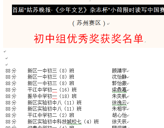 2014年小荷限时读写(苏州赛区)初中组优秀奖获奖名单 本站原创 2014-06-03 15:36:33 苏州奥数网讯:首届小荷限时读写(苏州赛区)获奖名单公布,以下为word版,方便大家查找。[查看原帖参与讨论] 点击下载Word完整版>>>初中组优秀奖获奖名单