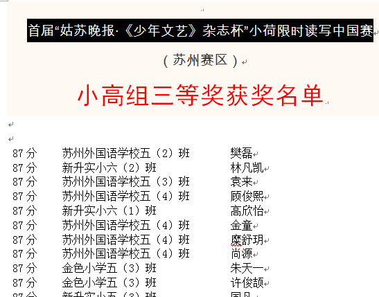 2014年小荷限时读写(苏州赛区)小高组三等奖获奖名单 本站原创 2014-06-03 15:54:16 苏州奥数网讯:首届小荷限时读写(苏州赛区)获奖名单公布,以下为word版,方便大家查找。[查看原帖参与讨论] 点击查看Word完整版>>>小高组三等奖获奖名单