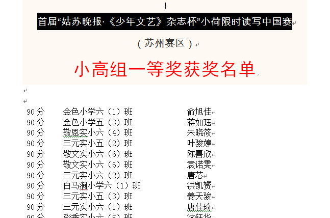 2014年小荷限时读写(苏州赛区)小高组一等奖获奖名单 本站原创 2014-06-03 16:10:17 苏州奥数网讯:首届小荷限时读写(苏州赛区)获奖名单公布,以下为word版,方便大家查找。[查看原帖参与讨论] 点击查看Word完整版>>>小高组一等奖获奖名单