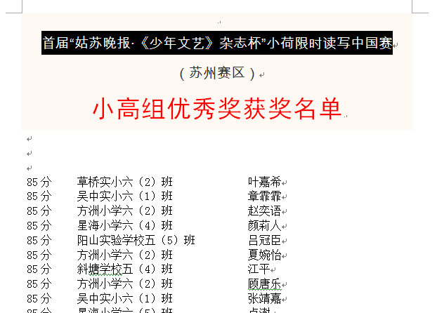 2014年小荷限时读写(苏州赛区)小高组优秀奖获奖名单 本站原创 2014-06-03 16:16:06 苏州奥数网讯:首届小荷限时读写(苏州赛区)获奖名单公布,以下为word版,方便大家查找。[查看原帖参与讨论] 点击下载Word完整版>>>小高组优秀奖获奖名单