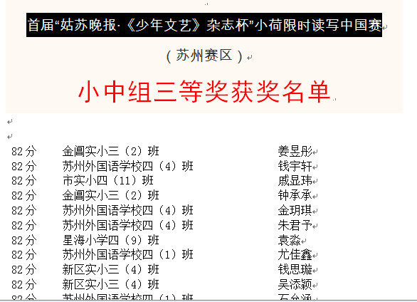 2014年小荷限时读写(苏州赛区)小中组三等奖获奖名单 本站原创 2014-06-03 16:37:57 苏州奥数网讯:首届小荷限时读写(苏州赛区)获奖名单公布,以下为word版,方便大家查找。[查看原帖参与讨论] 点击下载Word完整版>>>小中组三等奖获奖名单