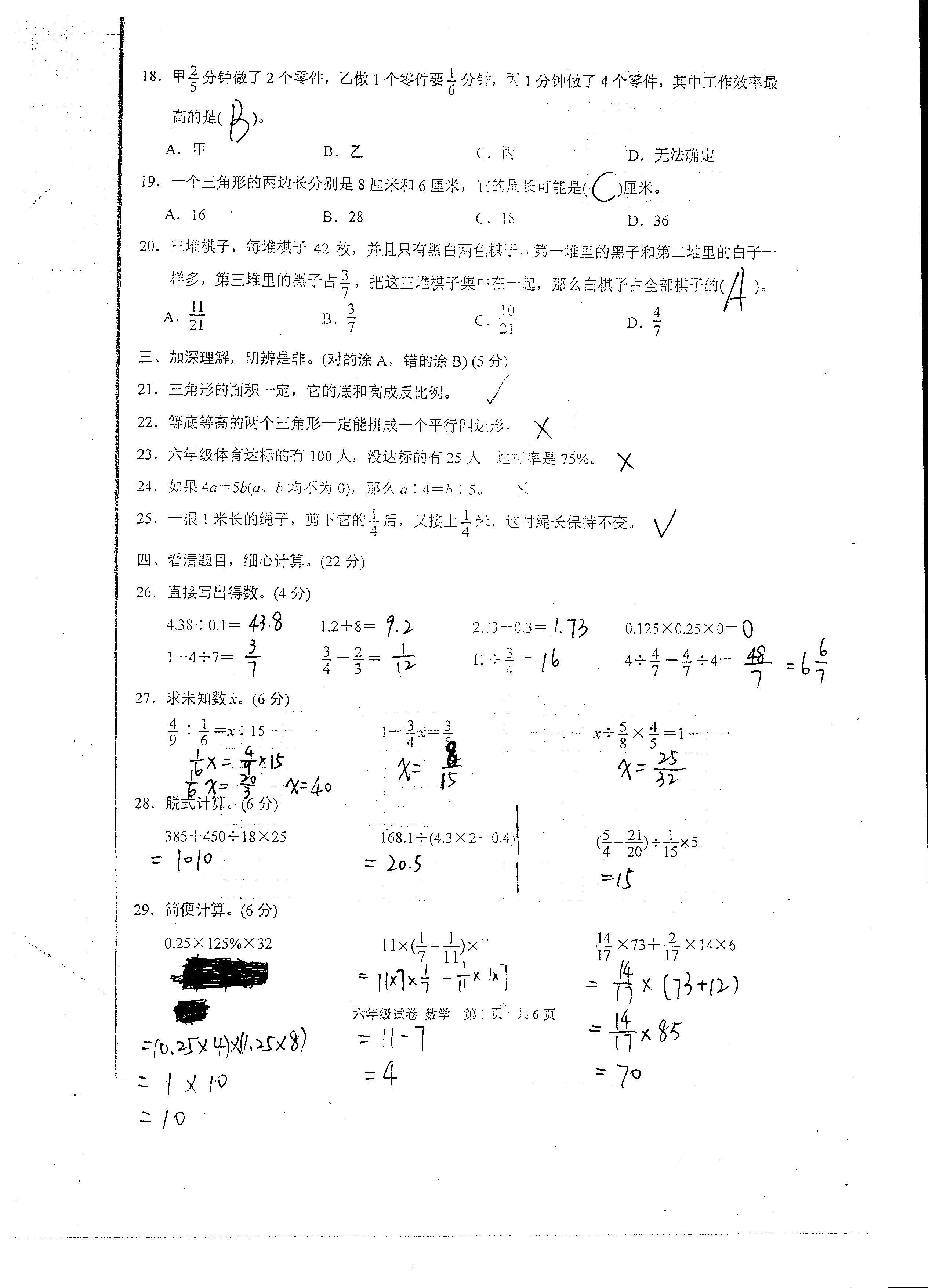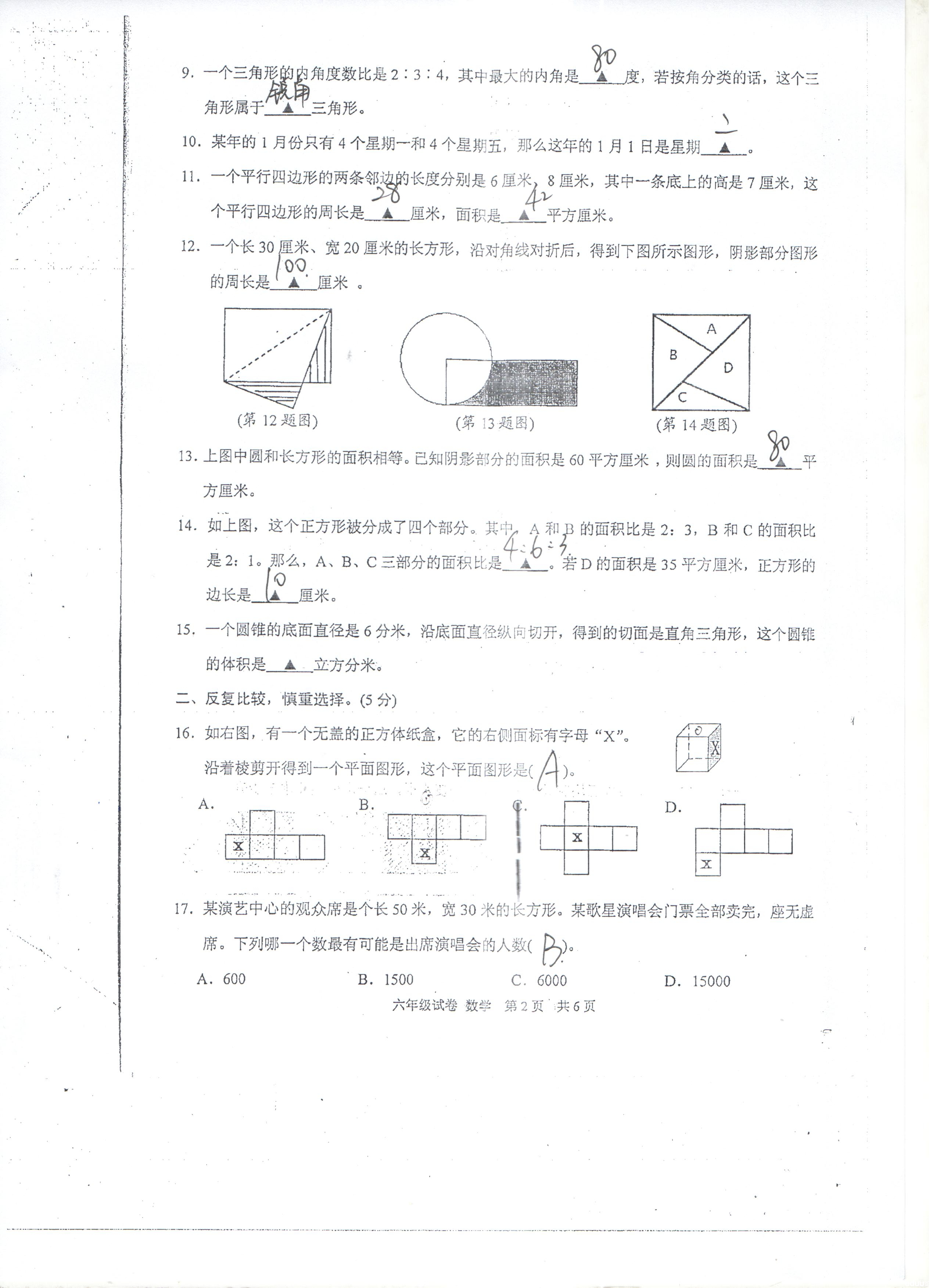 2014年苏州高新区小升初统考数学答案