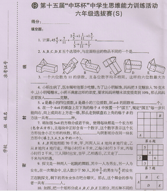 2015第十五届中环杯初赛六年级试题