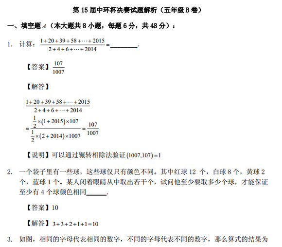 苏州奥数网:2015年第十五届中环杯苏州赛区决赛于3月14号进行,考后小编及时将各年级试题及试题详解整理、总结如下: