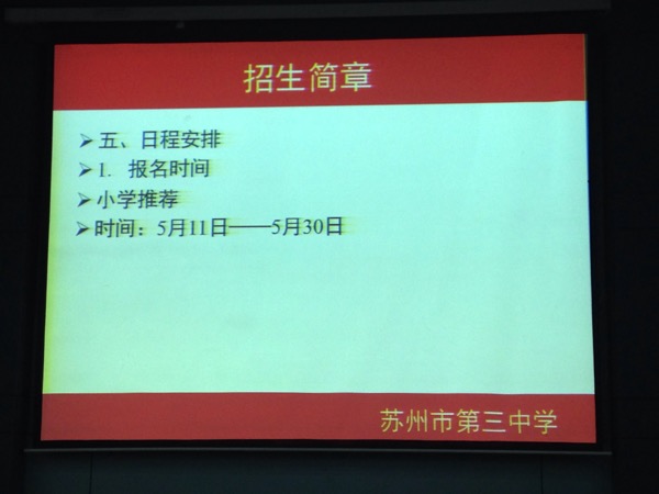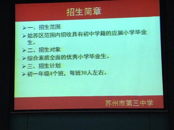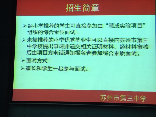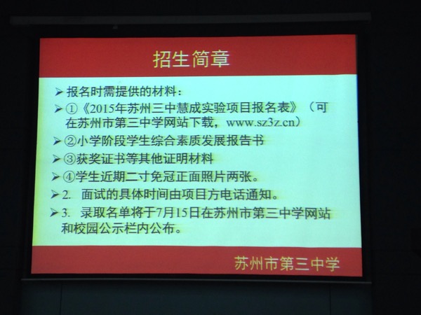 5月31号苏州市三中慧成项目推介会现场报道(3) 苏州奥数网 2015-06-01 18:17:24 相关阅读推荐: 苏州草桥中学6月6日小升初开放日活动安排 2015年苏州市24中(原光华中学)小升初招生简章 苏州中学伟长实验班的学籍、蓝条问题 家长分享:2015苏州中学伟长班自荐报名表下载 首页 上一页 下一页 尾页