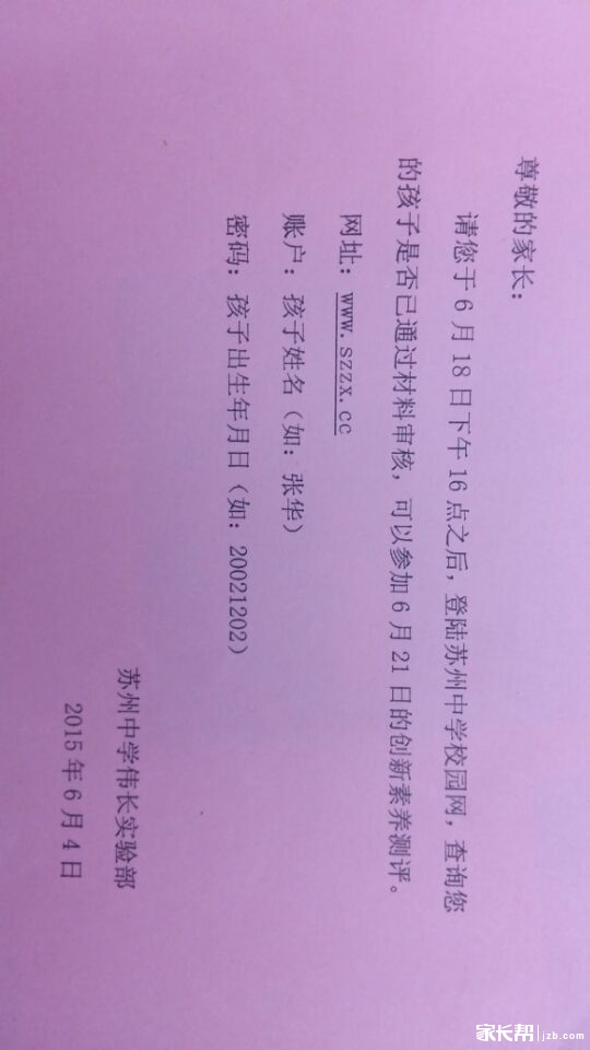 报名伟长班考试的家长,可以在6月18日下午四点后,登录苏州中学网站,查询孩子的材料是否已经通过审核,审核通过的可以参加6月21日的创新素养测评。