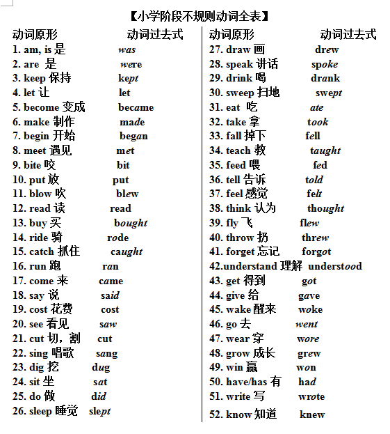 2016小升初英语必备不规则动词 苏州奥数网 2015-10-14 13:37:56 【导语】不规则动词在小学阶段算是一个难点,这些动词变为过去式并不是+ed,所以需要特别记忆。下面小编总结了小学阶段的所有不规则动词,分享给大家。 相关链接: 2016苏州小升初语数外三科备考全资料