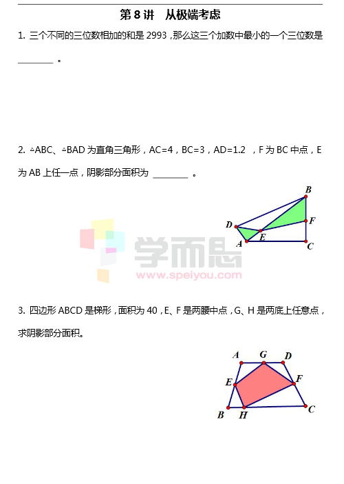 每一讲的预习题均包含3道题,都是六年级数学的辅导知识,并附有详细的答案解析,为同学们学好六年级数学知识做了很好的铺垫,因此希望同学们认真练习哟!