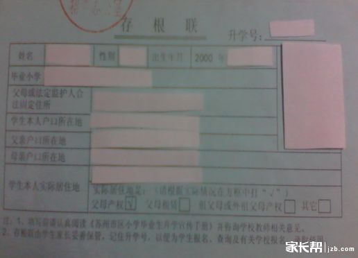 蓝条也称,小学毕业生登记表副表存根联,上面记录学生的基本信息,是学生入学的必要凭证。蓝条在小学生毕业时择校的时候,如果学校收下蓝条,就表明孩子报名成功,允许孩子在该校上学。所以,蓝条是孩子入学的凭证,也是一个保证。蓝条一般是市区(包括姑苏区、新区、工业园区)有,而吴中区和相城区是没有的。具体蓝条长什么样呢?家长帮论坛上也有: