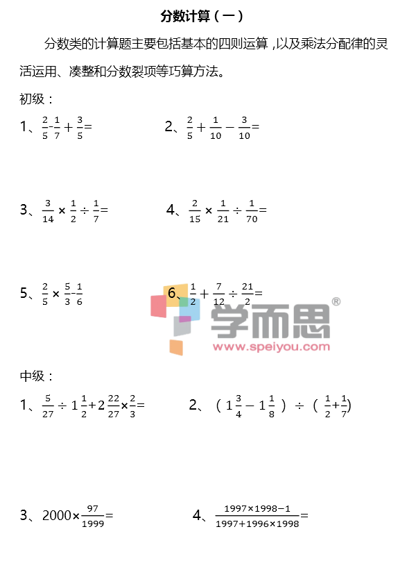 计算,在学习的每个阶段都是基础和重点,我们常说计算有5个境界:猛算,速算,巧算,心算,估算。为了让孩子有个良好的计算基础,下面分享学而思老师为我们准备的计算练习题。