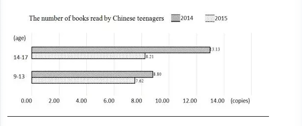 However, things are quite different among teenagers. Below is a chart which shows the number of books read by Chinese under age 17 in the years of 2014 and 2015 respectively (分别地).