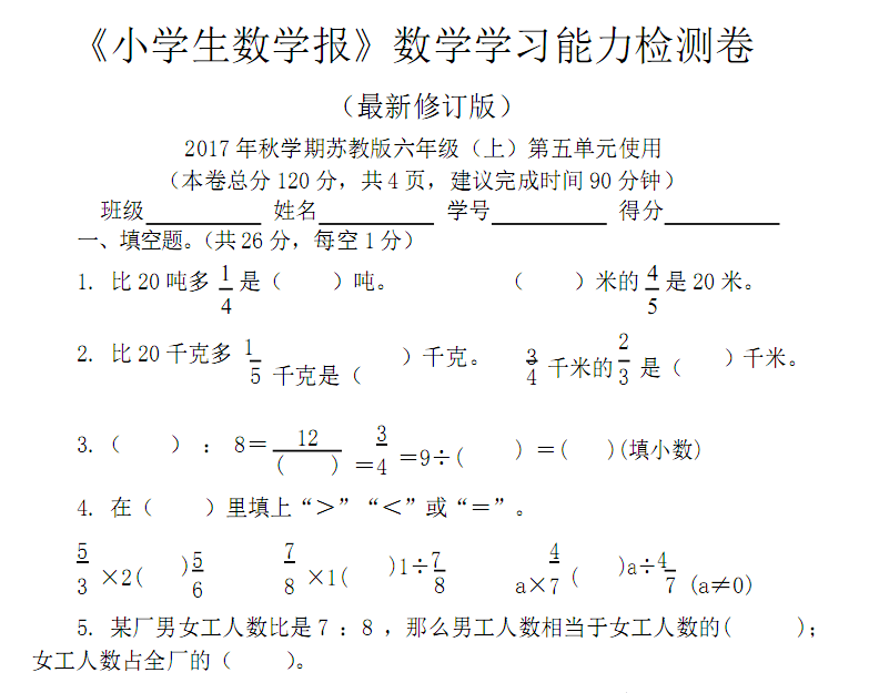 2018苏州小学生数学报六年级单元学习能力检测-第五单元1