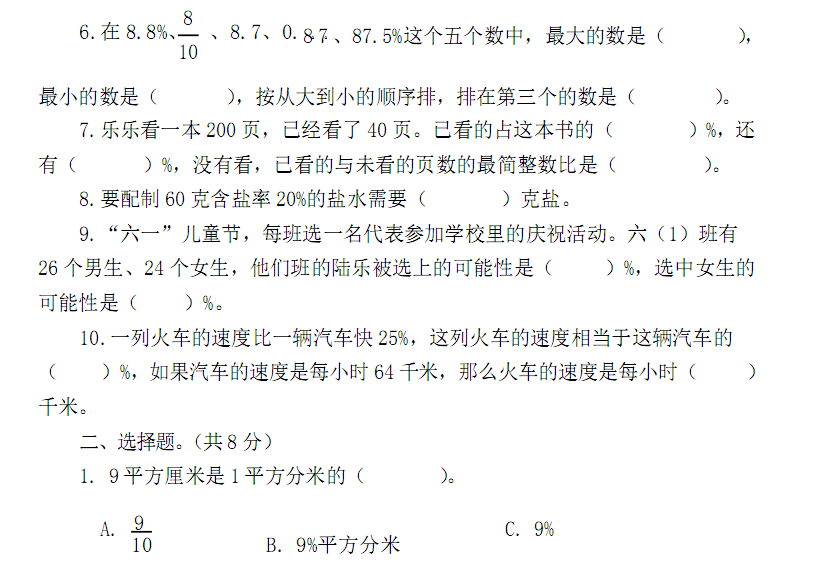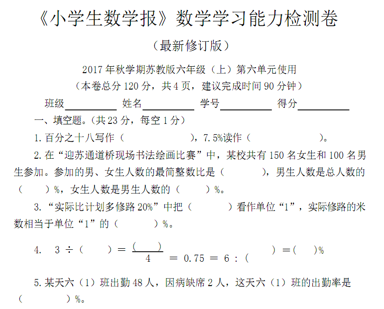 2018苏州小学生数学报六年级单元学习能力检测-第六单元1