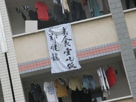 在一个挂满衣服的寝室阳台上,一张桌布迎风飘扬,上写:郑健龙来食堂吃饭。