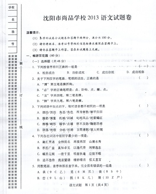 2013年沈阳尚品中学小升初考试语文真题