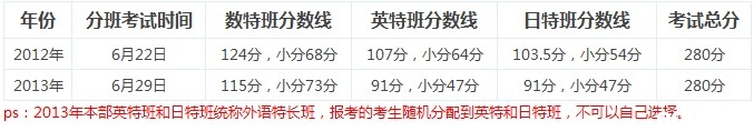 育才本部每年都会在小升初考试半个月左右后,对已经录取的学生进行分班考试,孩子们在考试前可以按意愿报考日特班,英特班,数特班和常态班,然后按分数择优录取,4种班型中以数特班孩子压力最大,但也最出成绩,大家可以看看2012年-2013年的分班考试的分数线,以作参考。