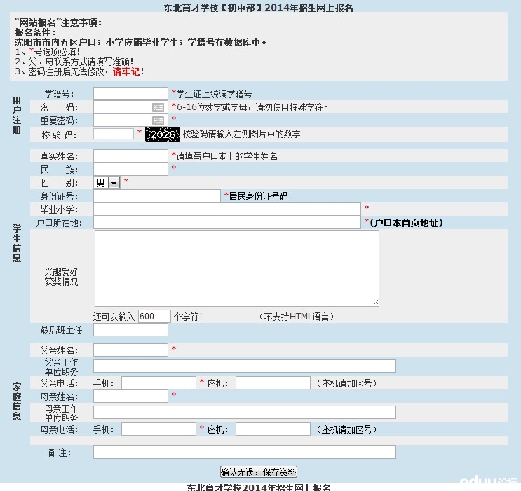 东北育才学校【初中部】2014年招生网上报名登记表