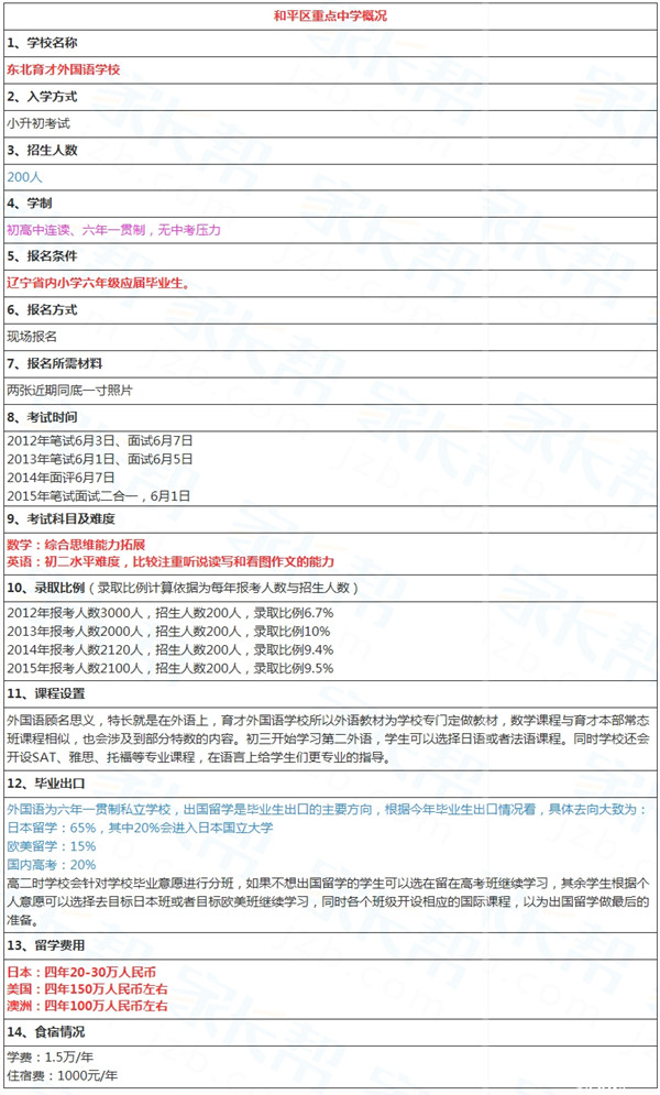 今天跟各位家长将从东北育才外国语考试难度、录取比例、课程设置、留学方向等等问题解读分享一下该中学的概况,详细信息如下: