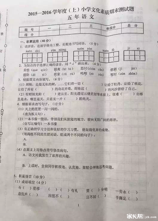 沈阳铁西区2015-2016学年度上学期五年级语文期末考试题