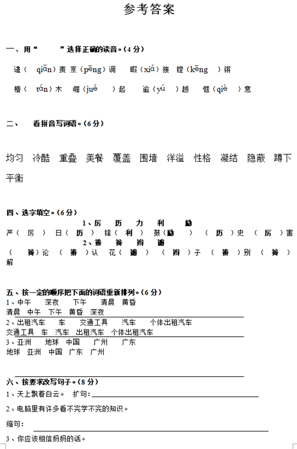 2019年沈阳小学四年级语文期末模拟试题(六)(4)