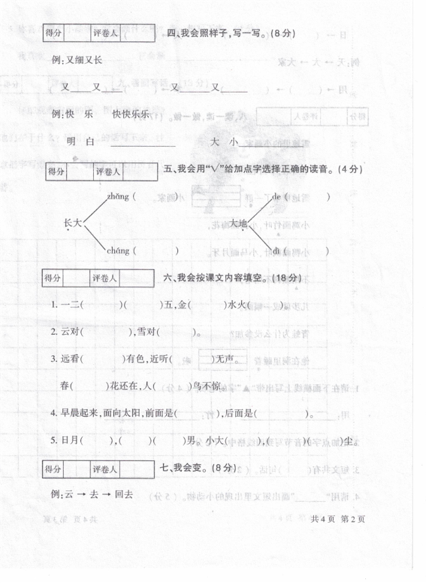 2019年沈阳市小学一年级语文期末模拟卷五(图片版)(2)