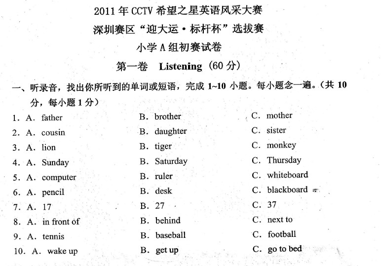 《2011CCTV希望之星英语风采大赛深圳赛区初赛试卷》 |
