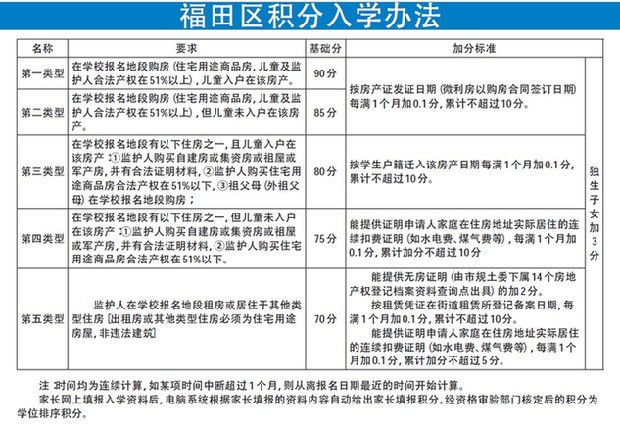 2013年学位申请将根据申请人提供的各项资料进行量化,对深圳户籍和符合“1+5”文件规定的非深户籍适龄儿童采 取积分入学办法,积分由基础分和加分两部分构成,以申请人在学区的住房情况和入户情况为基础分的积分条件,按申请人在学校地段居住时间长短、是否独生子女 等情况进行加分,具体办法如下: