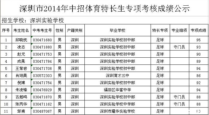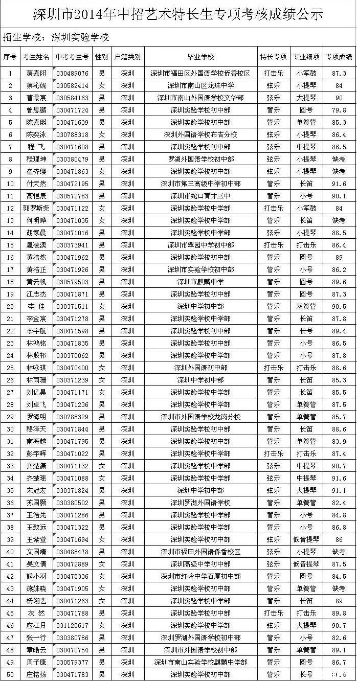 2014年深圳实验特长生考核成绩公示