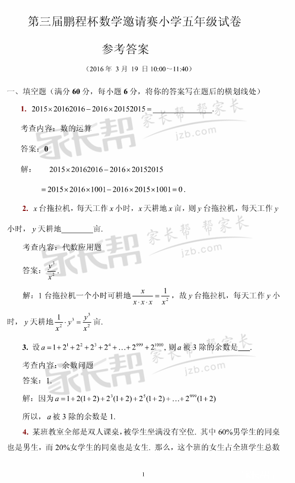 2016年深圳第三届鹏程杯数学邀请赛考试结束啦,下面小编将深圳第三届鹏程杯数学邀请赛小学五年级试卷及答案分享如下,供参考。