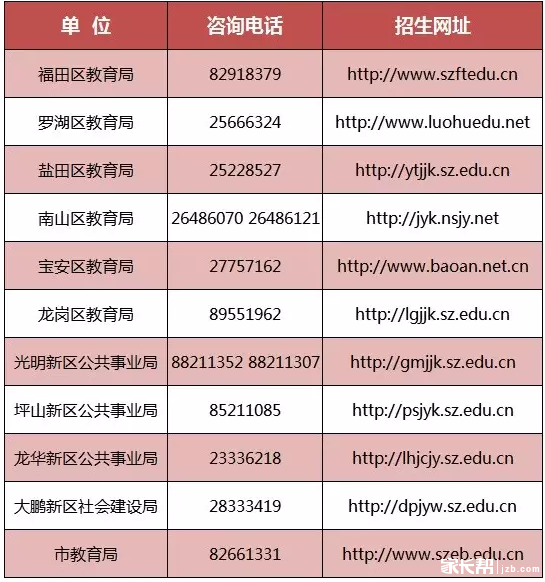 深圳市及各区教育局义务教育招生咨询电话及招生网址: