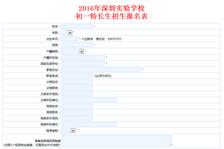 深圳实验学校2016年初一(小升初)艺术特长生招生简章公布【点击查看详情】,深圳实验学校2016小升初艺术特长生网上报名5月6日-20日进行,小编将深圳实验学校2016小升初在线报名表分享如下。